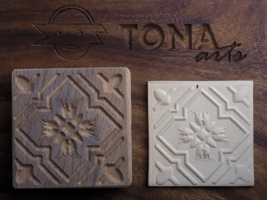 Nicht nur die eigenen Fliesen kann man damit schnell und einfach herstellen, sondern auch Blockdruck und Prägungen auf Papier, Pappe, Wachs und Stoff, sowie das Strukturieren von Keramikobjekten.