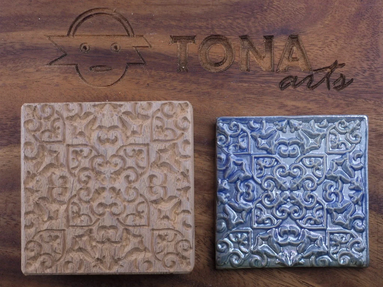 Nicht nur die eigenen Fliesen kann man damit schnell und einfach herstellen, sondern auch Blockdruck und Prägungen auf Papier, Pappe, Wachs und Stoff, sowie das Strukturieren von Keramikobjekten.