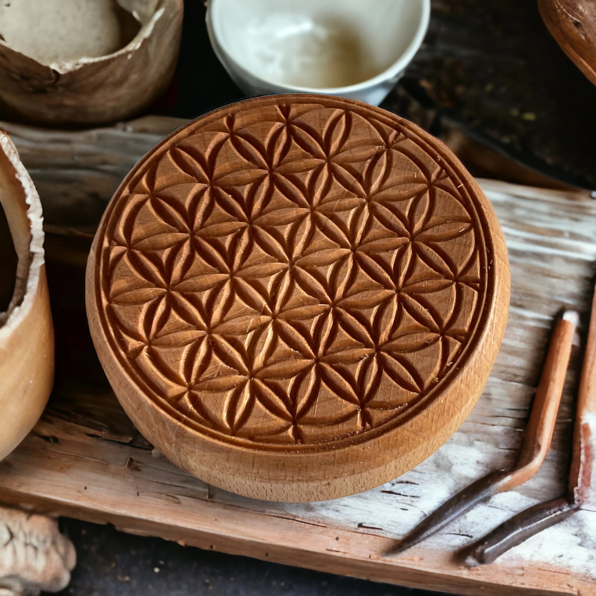 Unsere Mandala Stempel sind, im Gegensatz zu den vielfach angebotenen 3D Druck Stempeln aus Plastik, tief gefräst und haben abgeschrägte Stege. So lassen sie sich leicht von Ton lösen und die Prägungen sehen unglaublich plastisch aus.