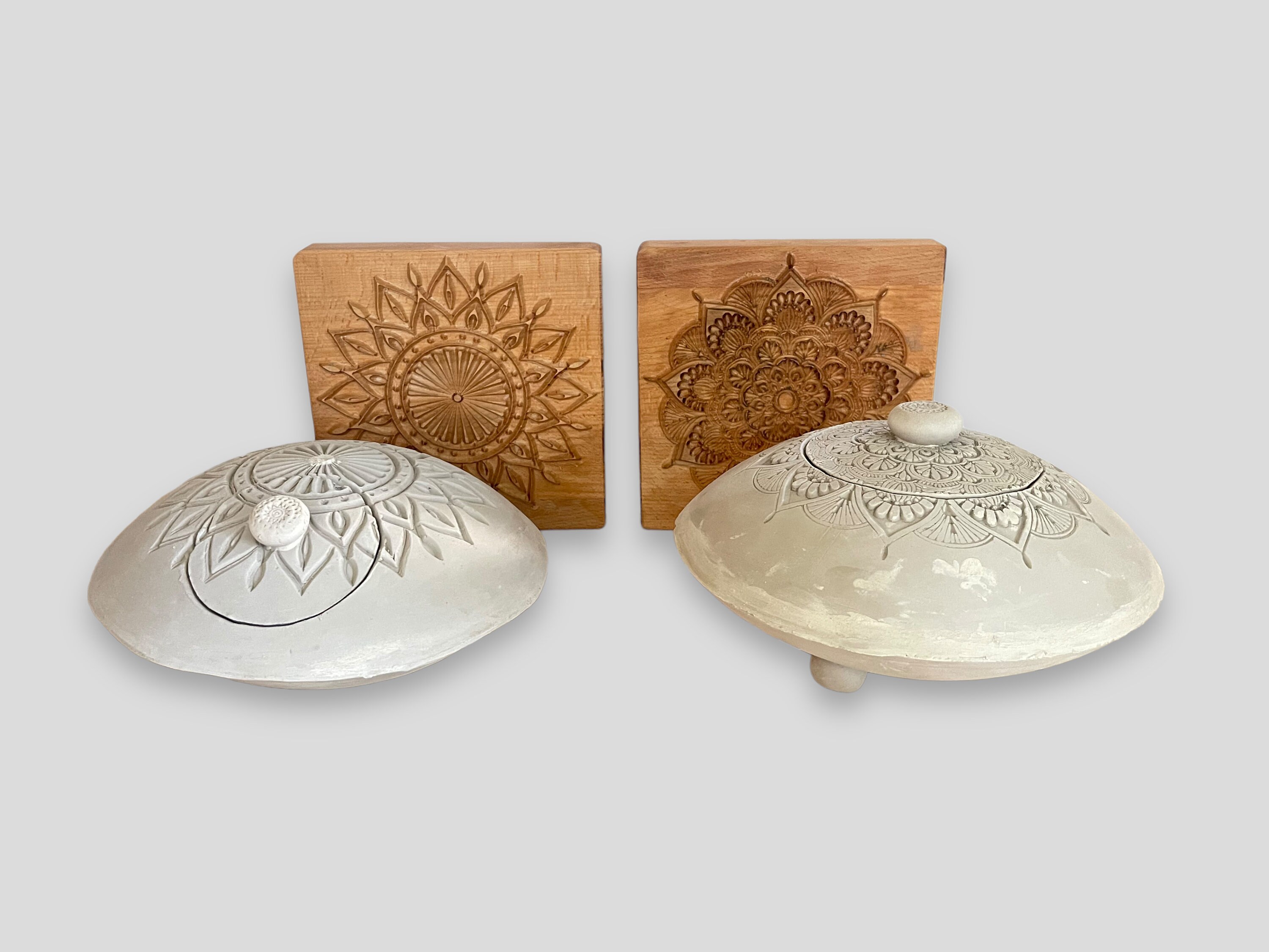 Unsere Mandala Stempel sind, im Gegensatz zu den vielfach angebotenen 3D Druck Stempeln aus Plastik, tief gefräst und haben abgeschrägte Stege. So lassen sie sich leicht von Ton lösen und die Prägungen sehen unglaublich plastisch aus.