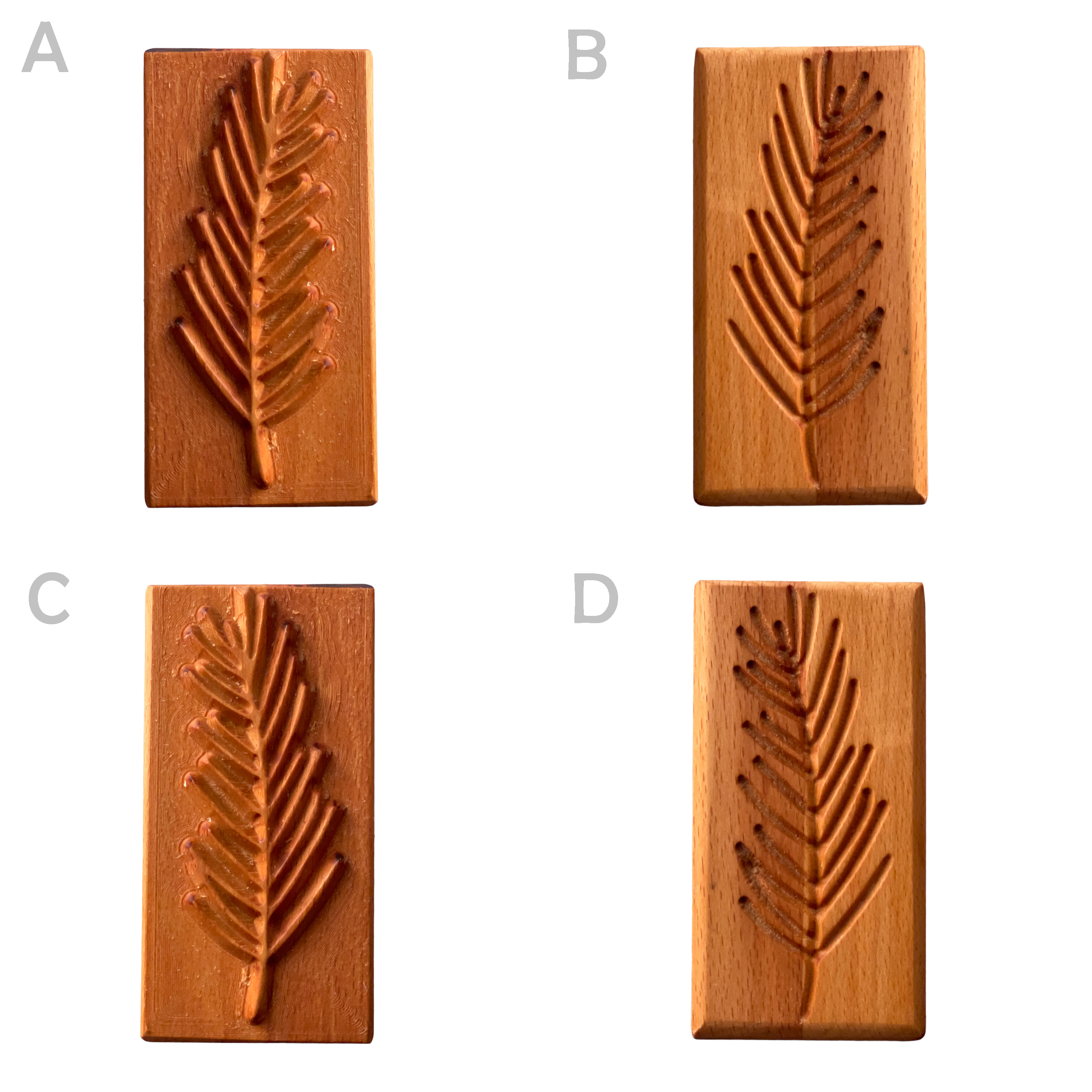 Alle unsere geschnitzten Holzstempel und Handroller sind tief gefräst und haben im Gegensatz zu gelaserten Stempeln und 3D-Druck-Plastikstempeln abgeschrägte Stege. So lassen sie sich leicht aus dem Ton lösen und das Druckbild ist deutlich plastischer und lebendiger.