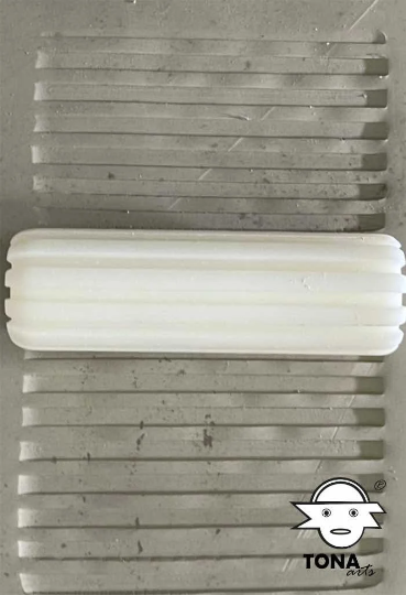 Der Unterschied zu den Rollern aus Holz ist, ausser dem Material, dass die Kunststoffroller, im Verhältniss zur Größe, eine unglaublich feine Struktur wiedergeben können. Allerdings mit dem Nachteil, dass sich diese Strukturen beim Prägen mit Material zusetzen können. Die Stege bei dieser Art Rollern sind senkrecht und reißen schneller beim Rollen Material mit.